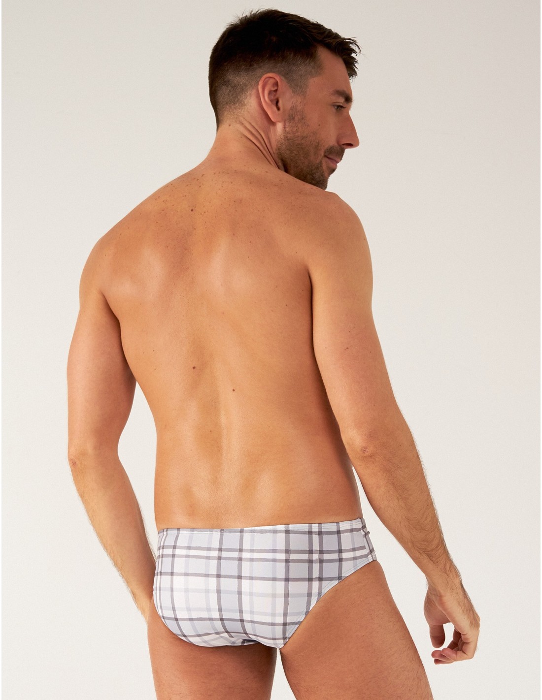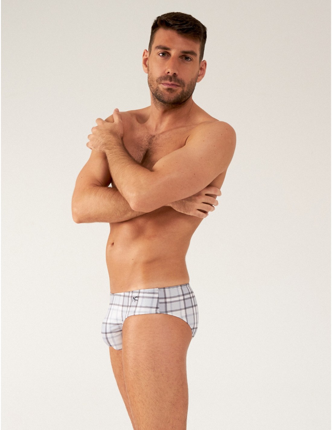 Grey tartan bikini briefs with discreet details by Adam Smith. The Saltire Bikini Briefs are a medium rise men's bikini designed for every day wear. The fabric is super soft, jersey microfiber that feels cool and fresh. The design features a grey tartan body with an almost flat front. The back is seamless and cut higher in a classic bikini style. This style is normal rise and has very discreet branding, the Adam Smith AS logo printed in the side. The Saltire Collection of Adam Smith draws inspiration from the Scottish Highlands. It is a limited edition collection featuring masculine colours and a stunning, tartan print.