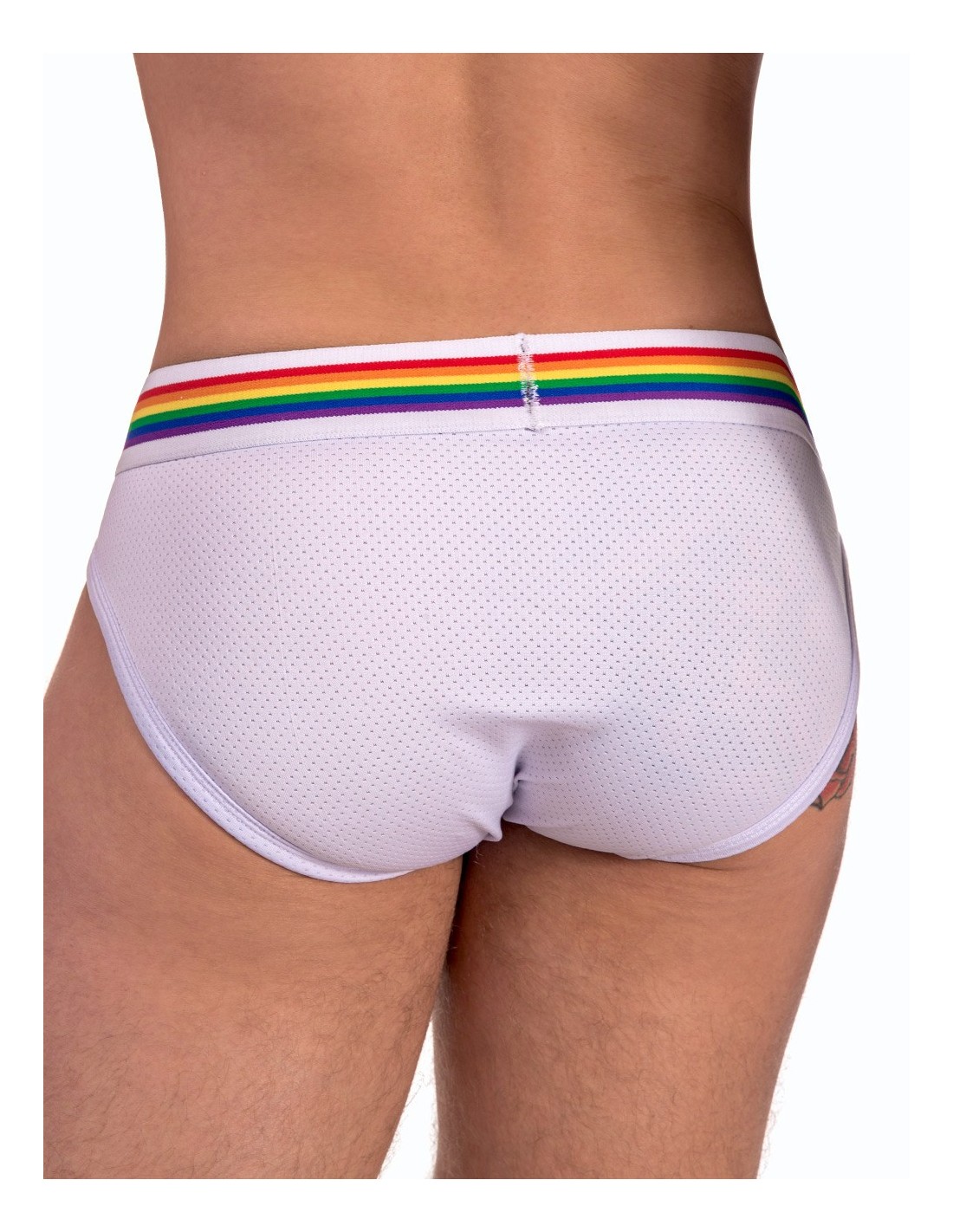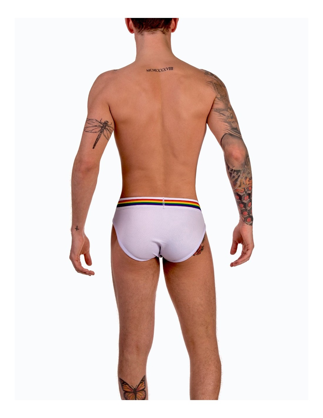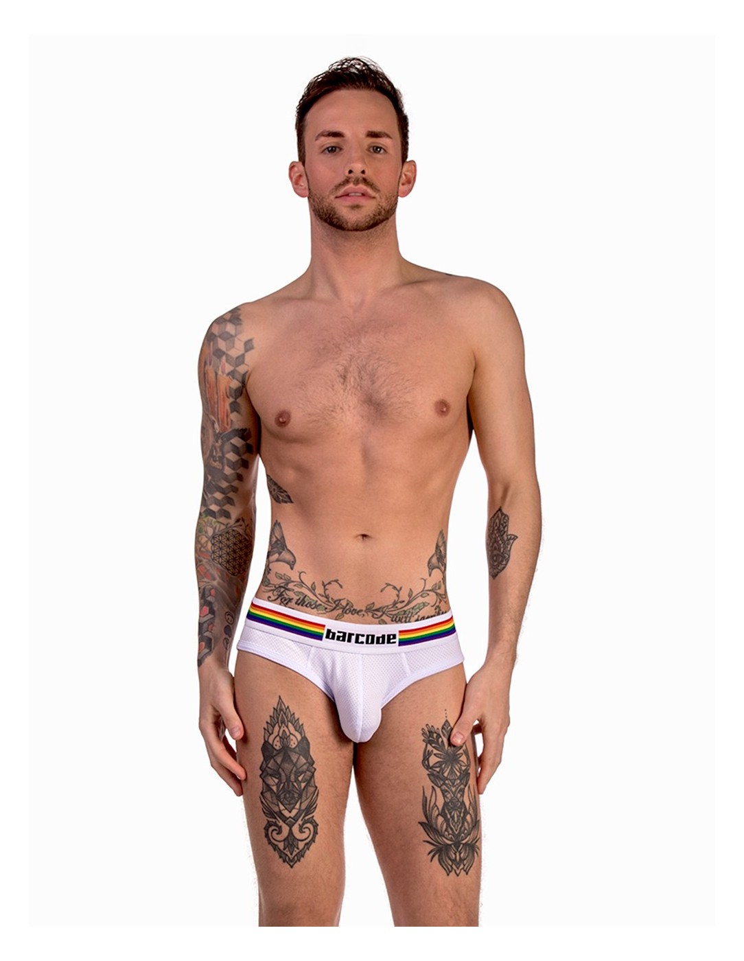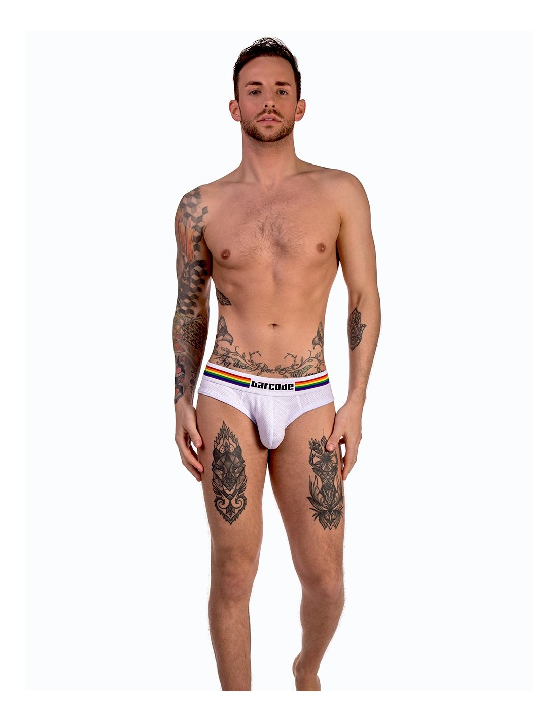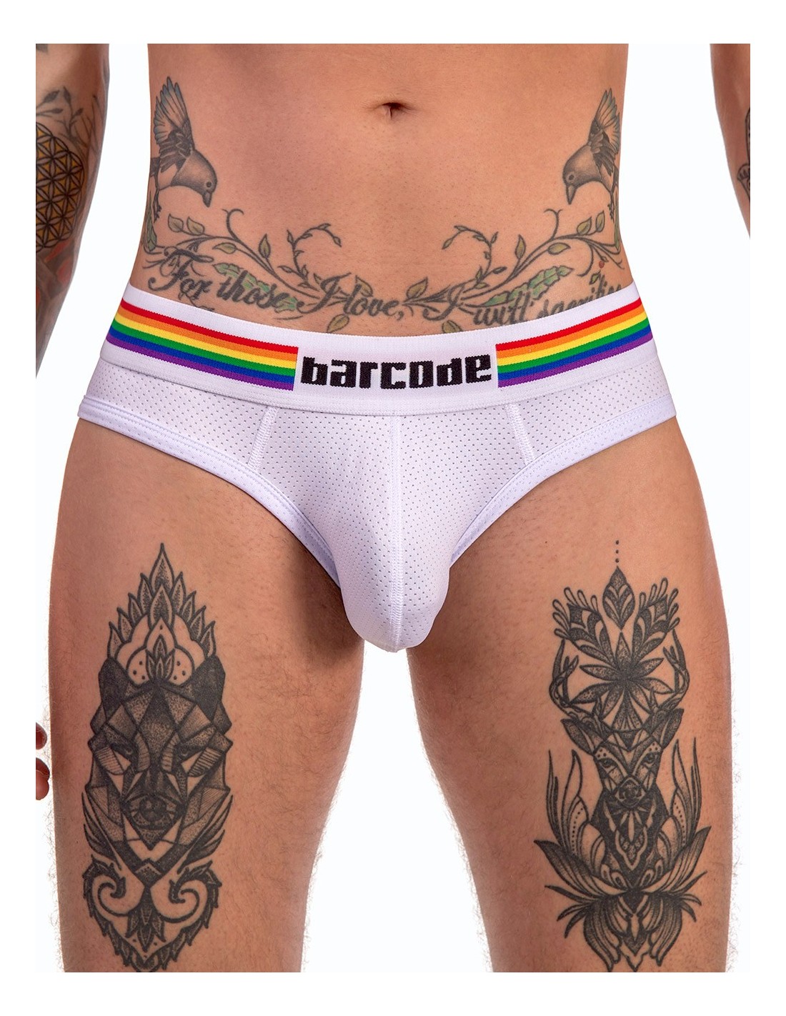 The Pride Briefs from Barcode Berlin invite you to celebrate Pride all year round. These white, low-rise briefs are made from an athletic mesh that helps keep you cool. The design features a Pride-themed waistband that showcases the Barcode logo in the centre, framed by a rainbow pattern. The contoured pouch provides extra space where it's needed, while the stretchy fabric offers support without restrictions. This style is designed in Berlin and produced in Portugal.