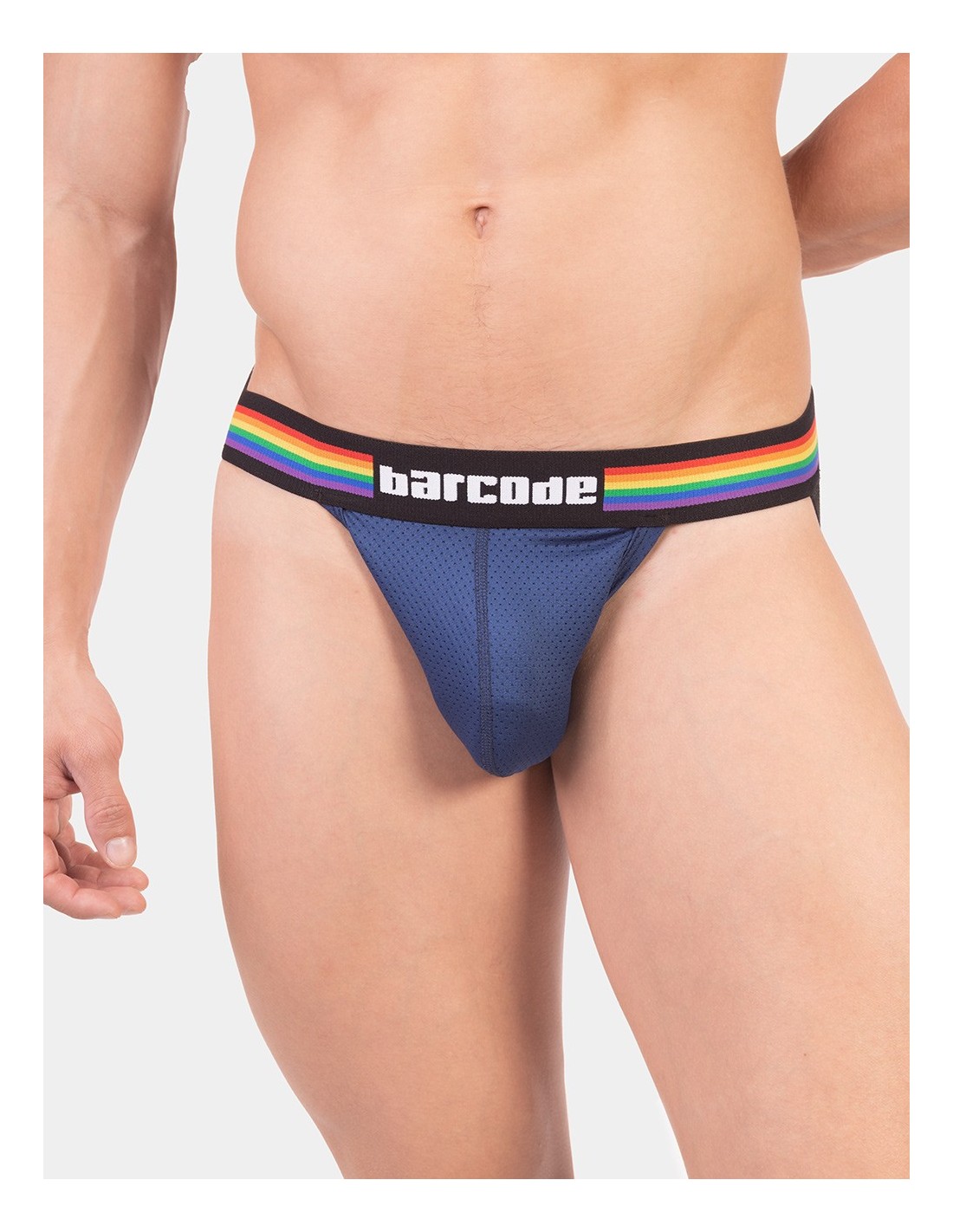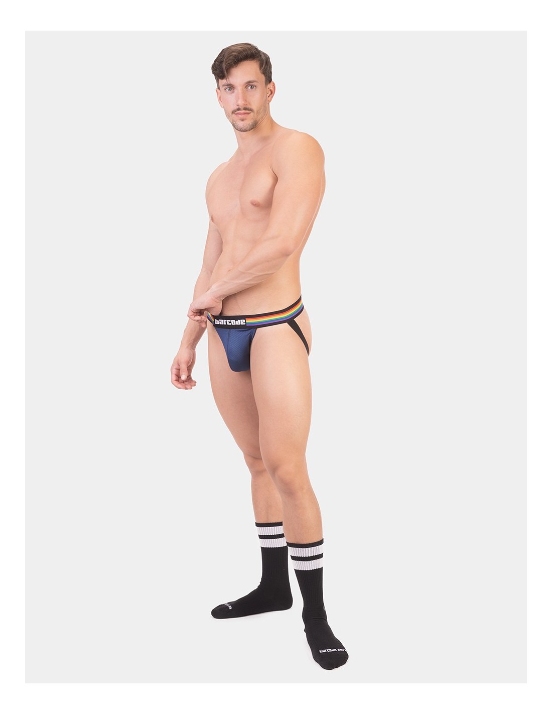 The Pride Jocks of Barcode Berlin are an invitation to celebrate Pride all year round. This navy jockstrap is low rise, made from an athletic mesh that will keep you cool for longer. The pouch of the underwear is elevated with a Pride themed waistband bearing the Barcode logo in the centre framed with a rainbow pattern. The pouch is contoured to add space where you need it. The fabric is quite stretchy so you get a nice support but without restrictions. The leg straps are black and sturdy. This style is designed in Berlin and produced in Portugal.