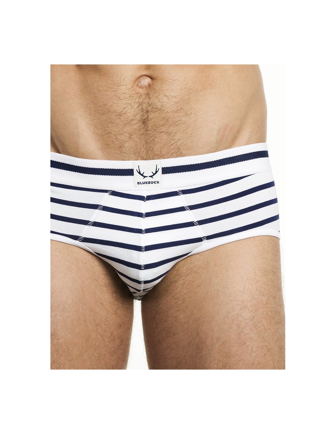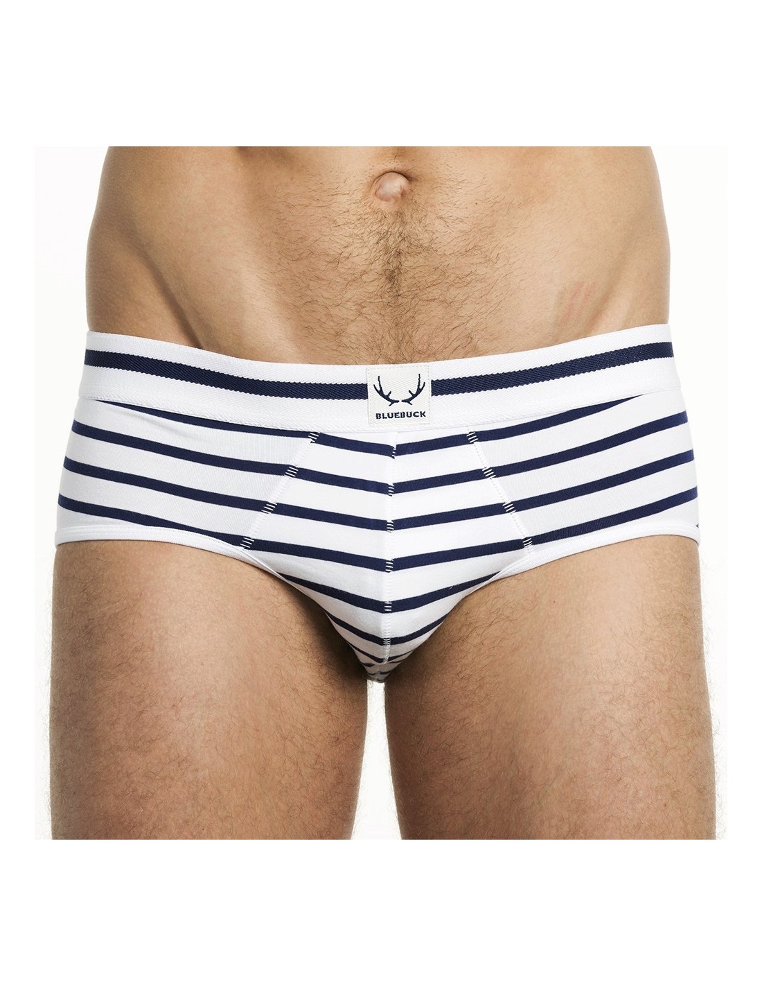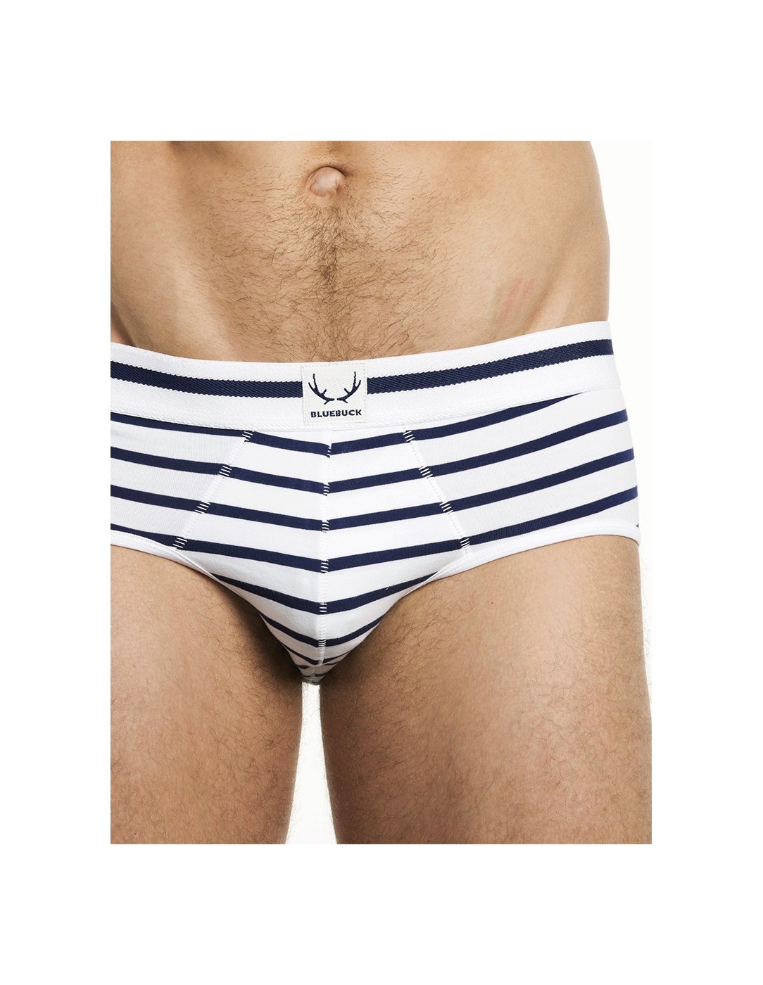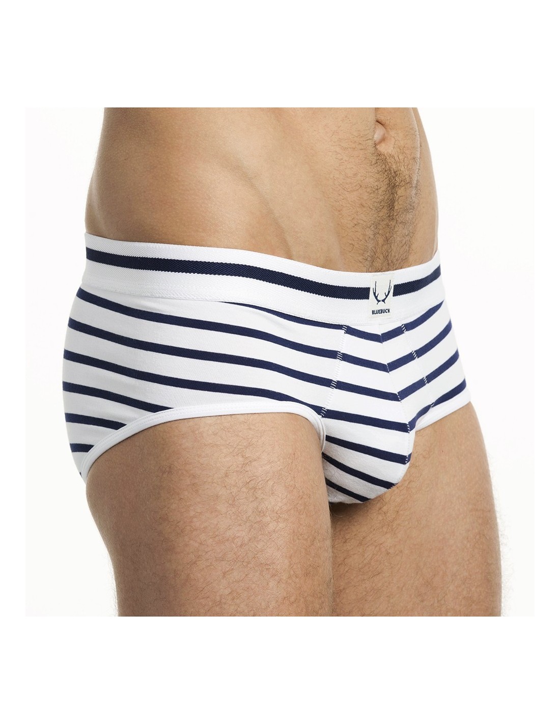 A Men and Underwear approved pair of blue briefs with white stripes from the nautical collection of the UK based brand Bluebuck made from organic cotton.
