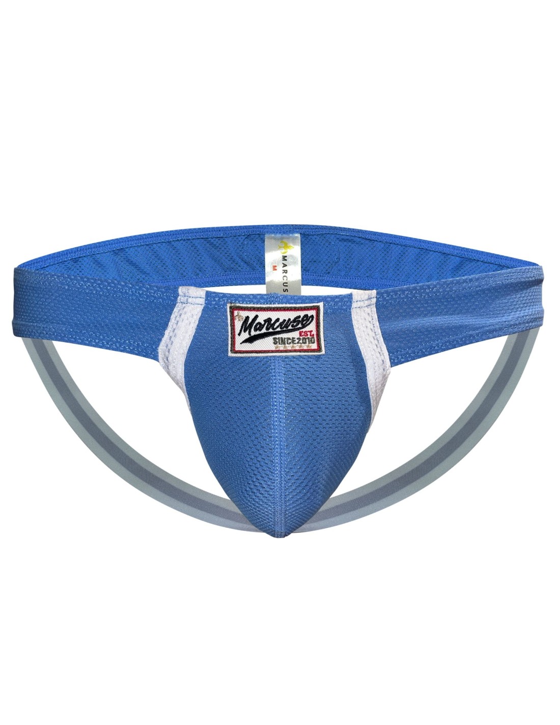 Blue jockstrap in a super low rise cut with contrasting detailing and legstraps and contoured pouch.