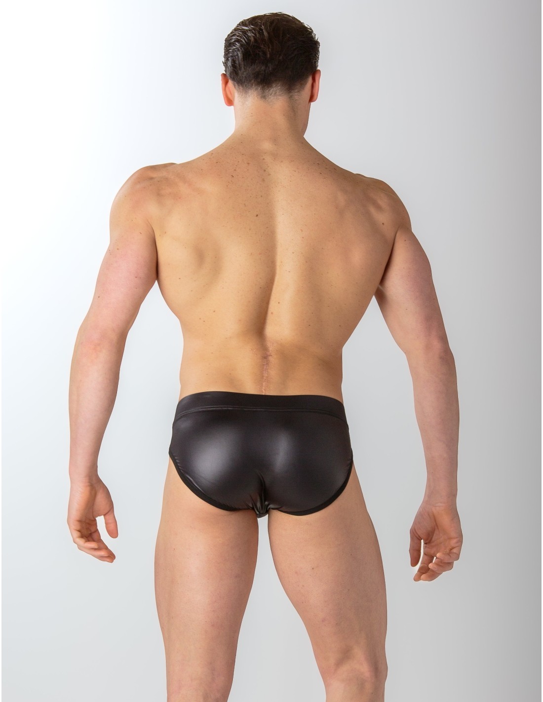 Black leatherette briefs in a short, tight-fitting silhouette with a V-shaped lace-up front, visible black tulle lining, and covered waistband.