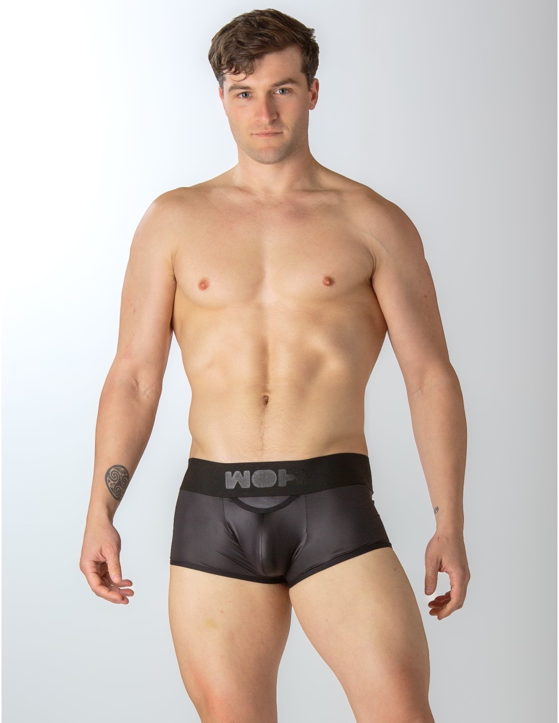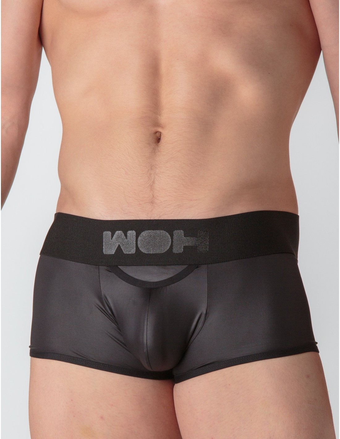 Black leatherette trunks in a short, tight-fitting silhouette with a wide, woven waistband and a silicone printed logo and the trademark WOH "smile" fly at the front.