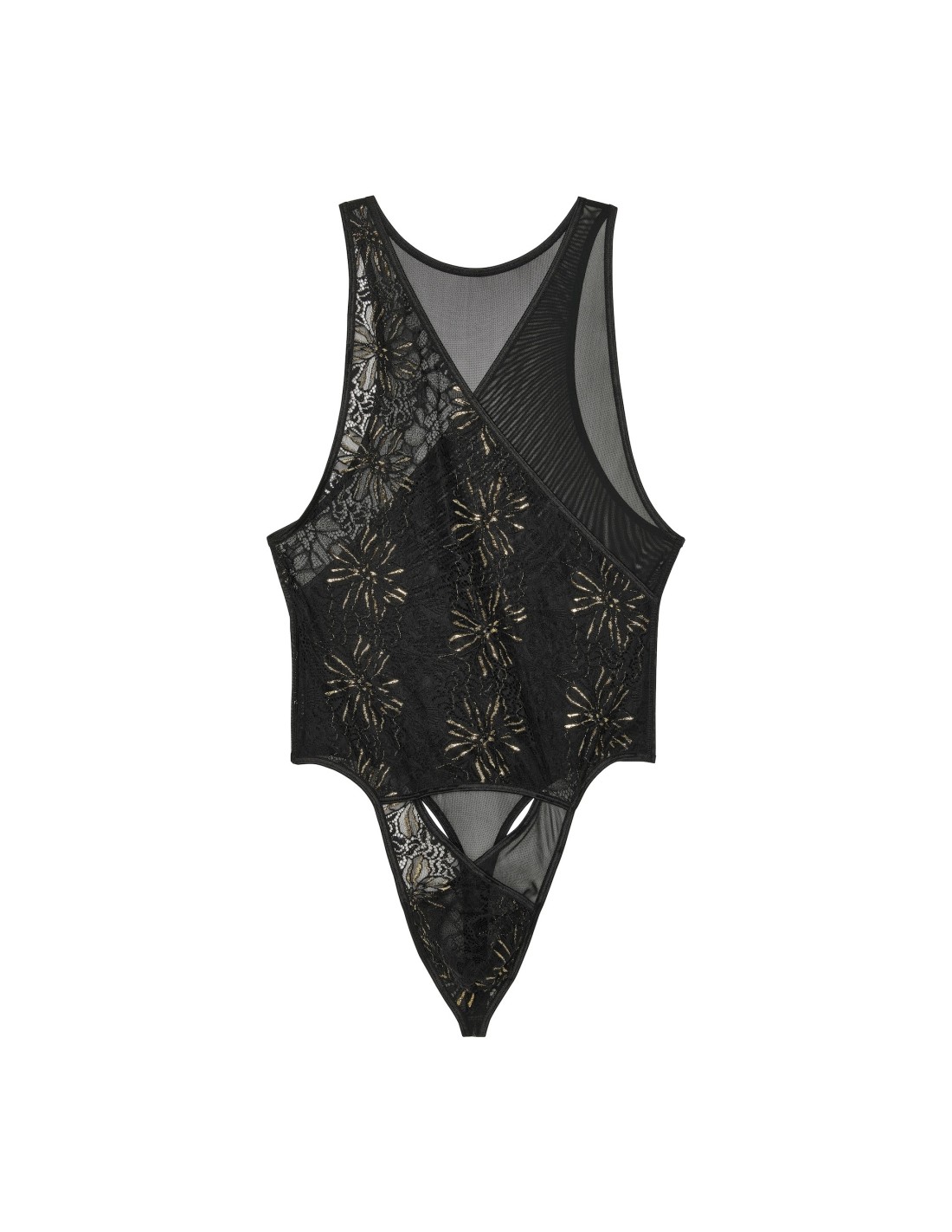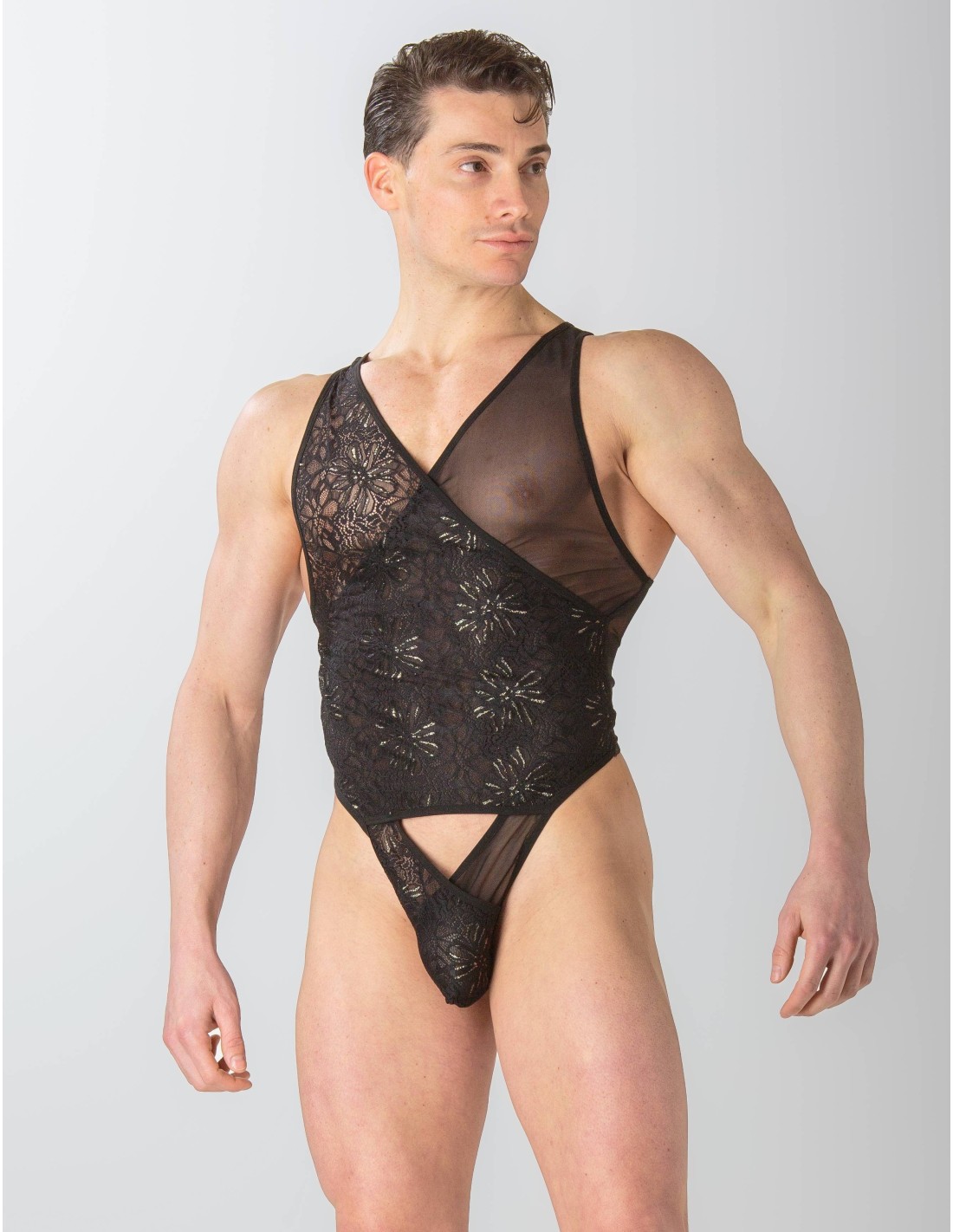 Men's bodysuit in a contemporary, tight-fitting silhouette crafted from a striking combination of black lace with metallic gold details and delicate black tulle.