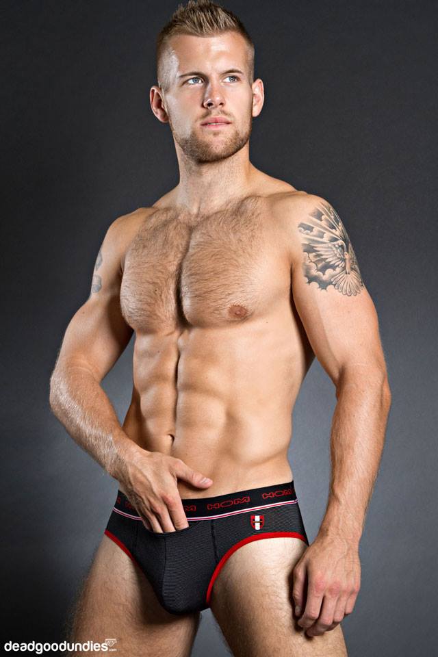 | Adam Coussins posing in the HOM Elysee HO1 mini brief for Deadgoodundies.com |