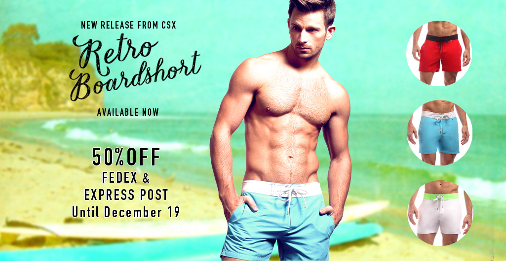 We have seen a trent recently in men’s underwear design with retro themed or retro look boxers and briefs. CSX goes one step further to extend this trent to men’s shorts. The brand has just introduced a new design called Retro Broadshorts. They brand describes them as “vintage style meets 21st century tech”. Indeed they look absolutely great: Microfiber fabric in a vintage cut, lace up drawstring waistband, velcro fly, mesh lining. Available now in three colours and four sizes. And since we know you would ask, the model posing in the new shorts is Derek Yates.