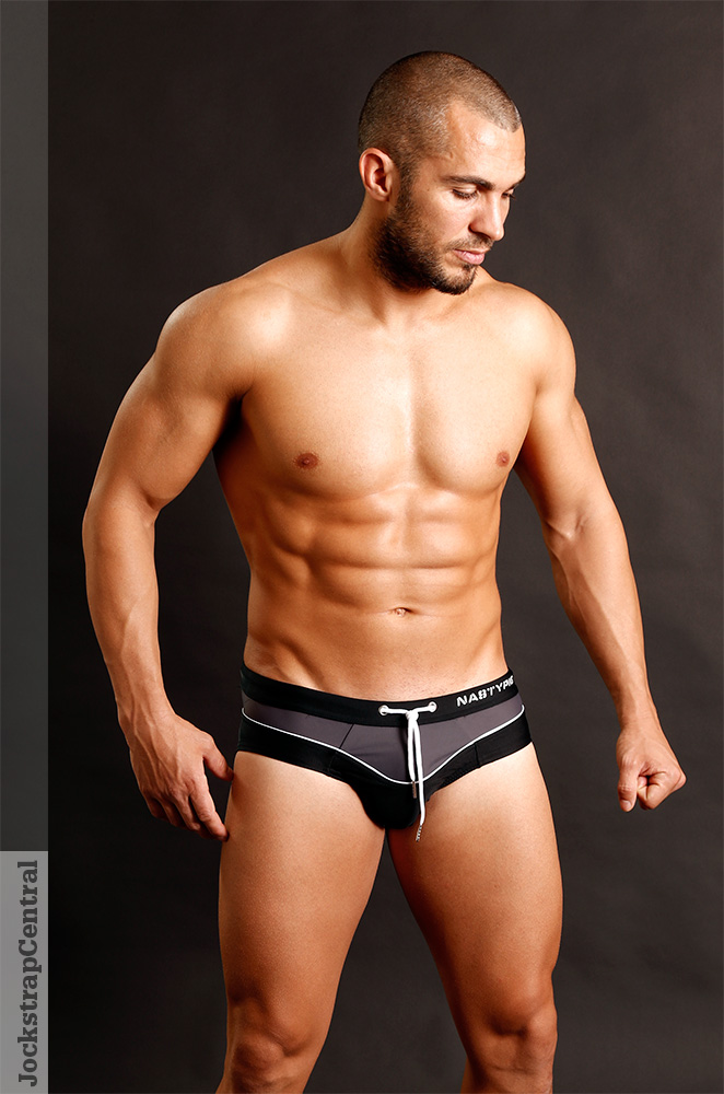 Extra hot, Portuguese and French mix, model Santos is back at Jockstrap Central to take their newly launched Nasty Pig Swimwear for a spin. The store has just stocked three swimwear styles: two form fitting bikini styles (Knockout and Wave Bikini) and the fitted Layback Swim Trunk (more of a form fitting nylon short) so there’s something for everyone. All three designs are loaded with high end detailing like metal eyelets, metal aglets and inner lining plus a metal snap button and fully functional fly for the Layback Trunk.