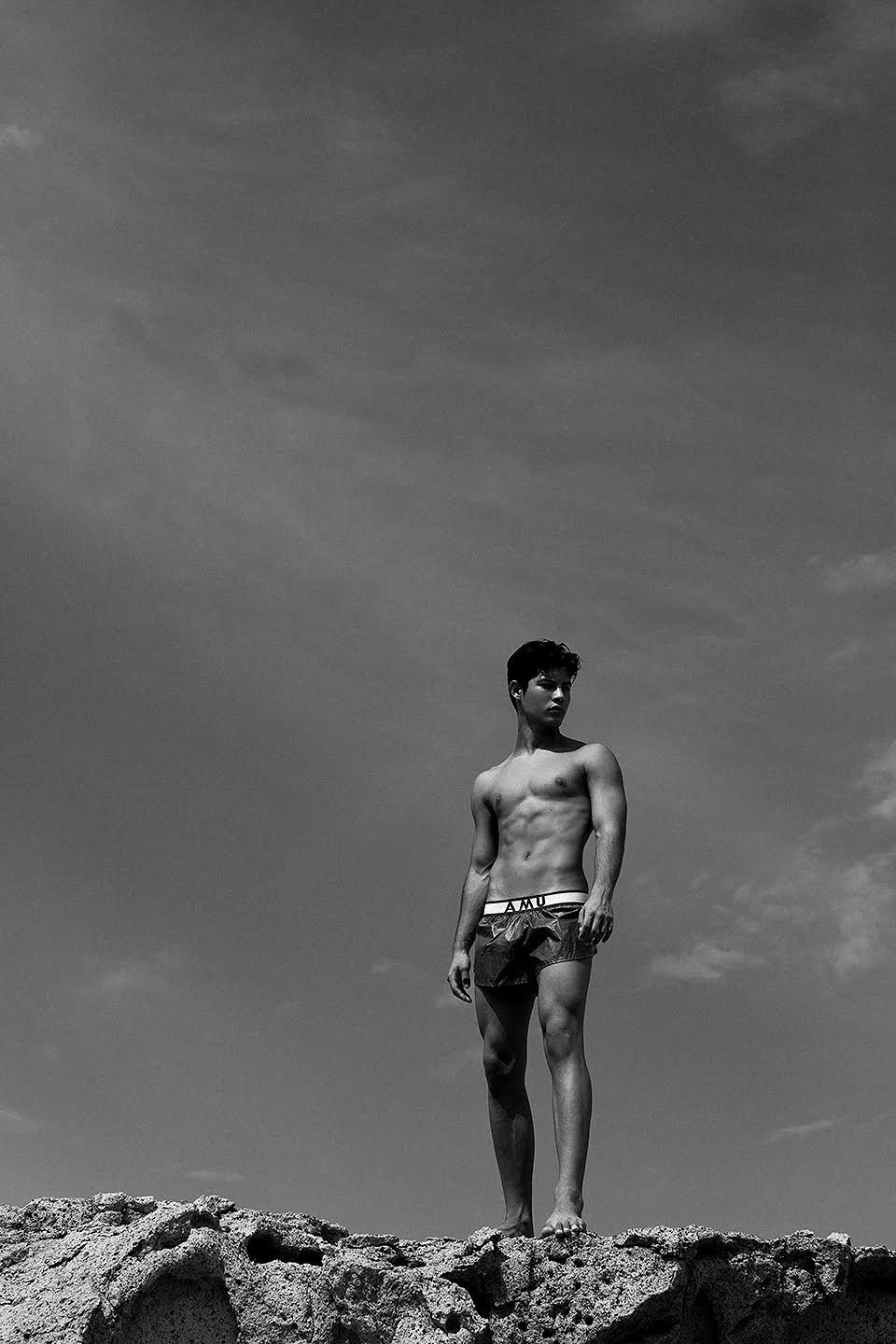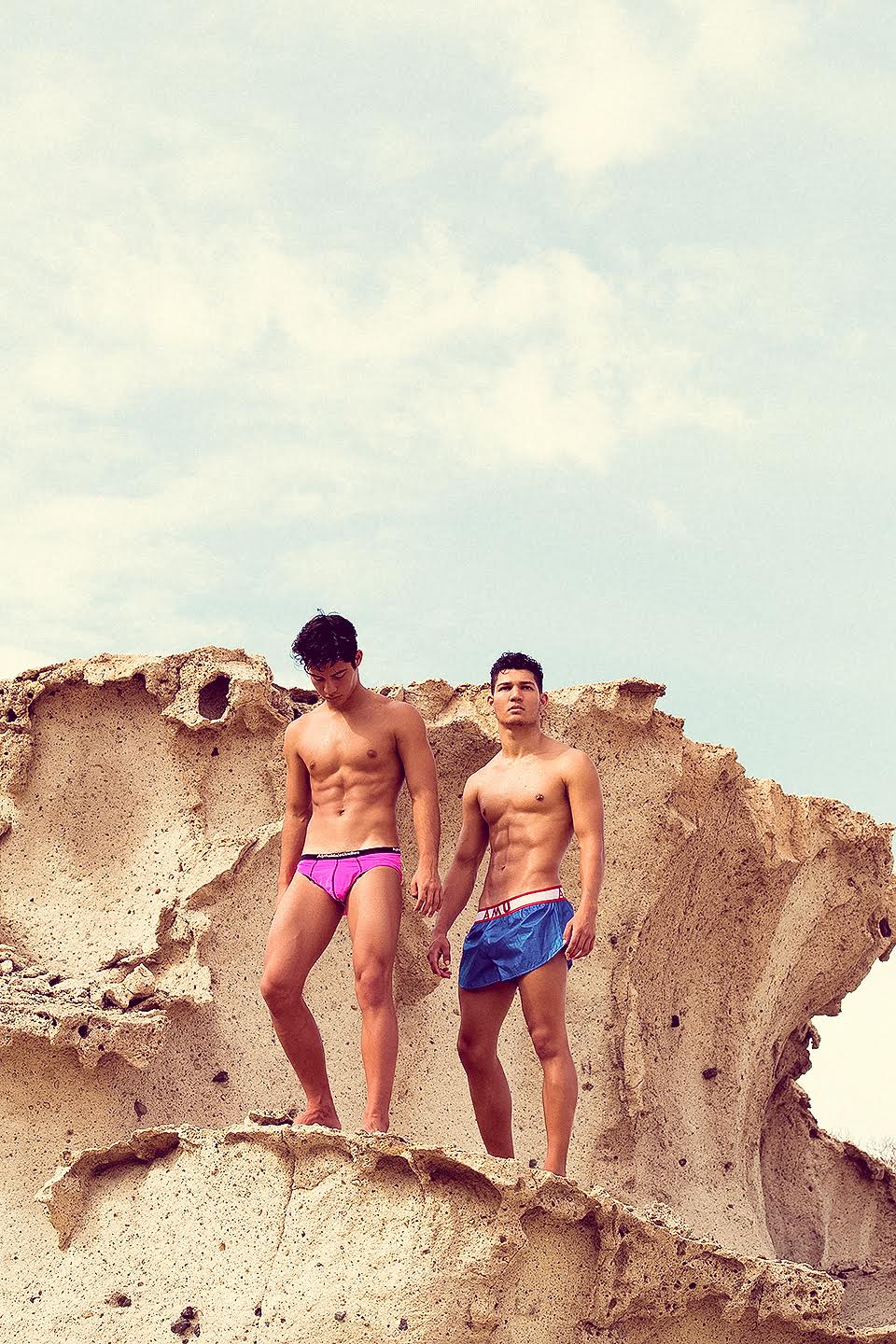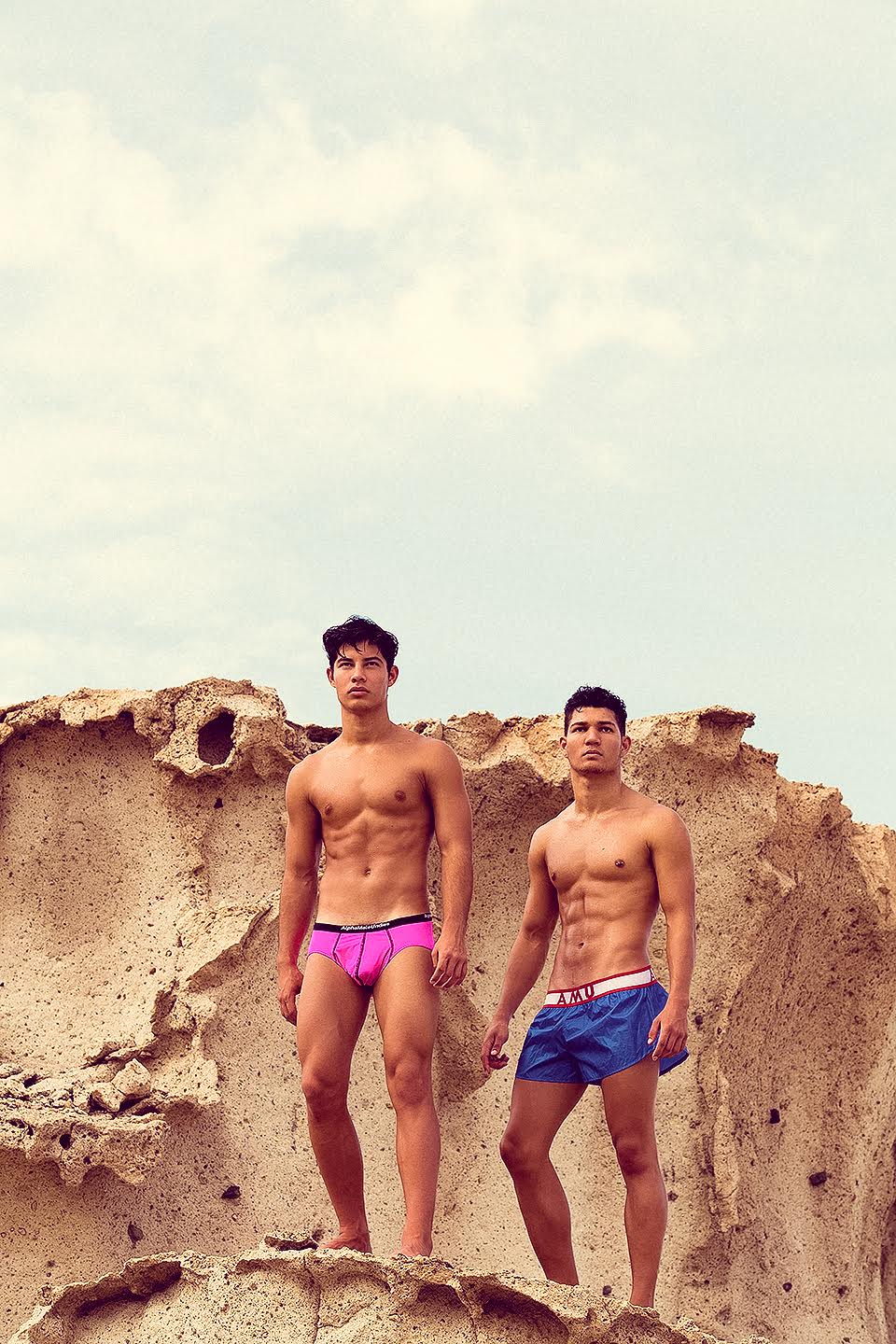 Here is one more outstanding work by Spanish photographer Adrian C. Martin. The photo-shoot you see below features brothers Miguel and Emilio Francisco posing in shorts and underwear by Irish brand AMU. Emilio is the one in the blue shorts and Miguel the one in white shorts. Both are Venezuelan living in Spain and this shoot took place in Tenerife, Canary Islands.