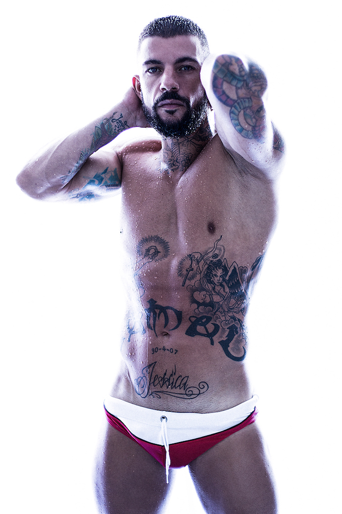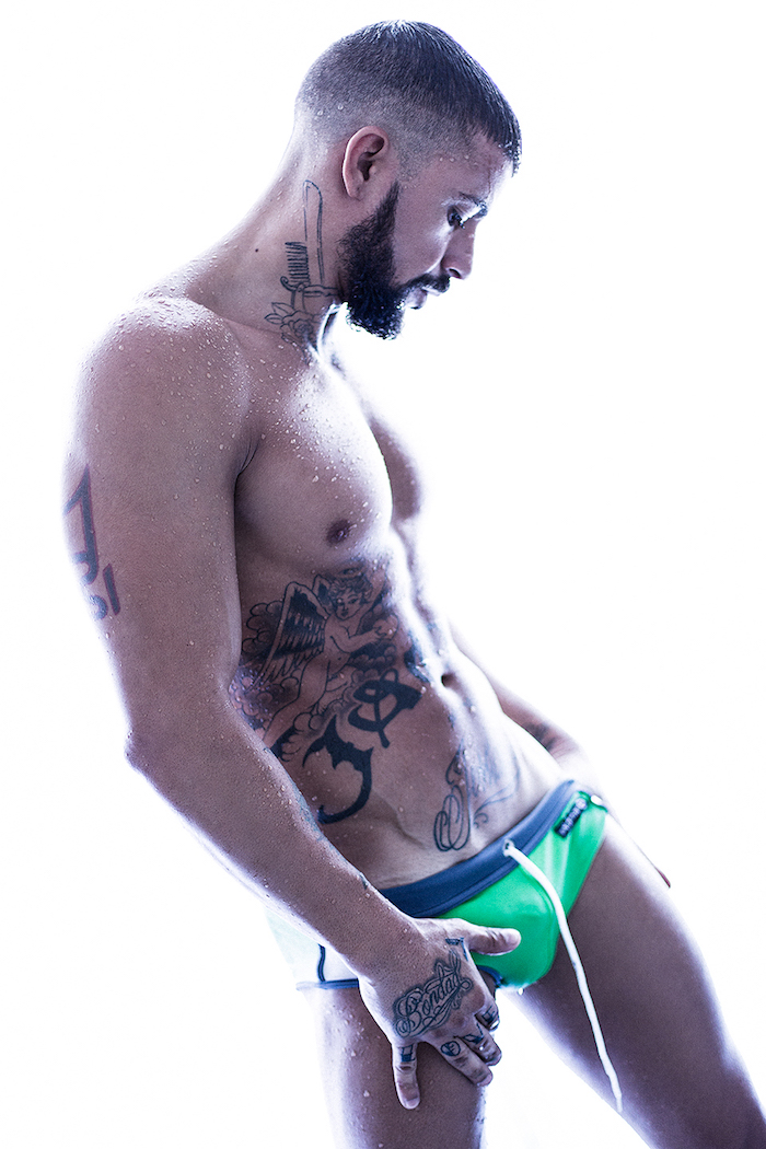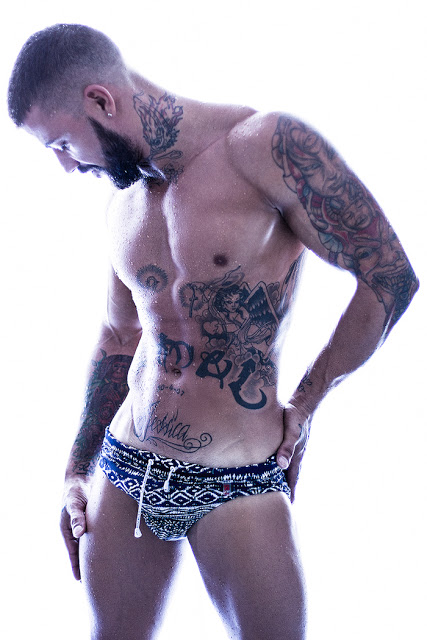 And this is the second part of the great editorial by Adrian C. Martin with model Alain Rodríguez. Just to remind you the underwear and swimwear featured are from the most recent collections of Clever, WildmanT and Hawai. This editorial is at the same time a study on the amazing tattoos of the model.