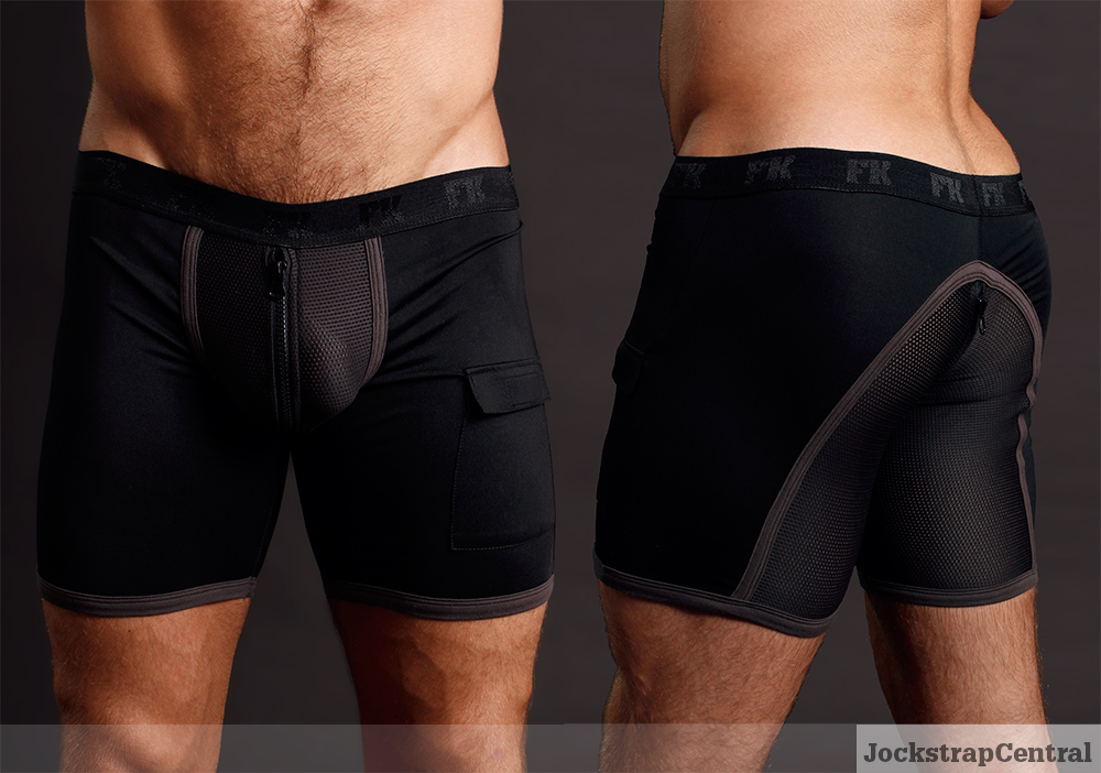 The guys at Jockstrap Central have just added some some ridiculously hot fetish shorts from Full Kit Gear to their collection. The shorts feature front pouches and rear panels in a micro-mesh and smooth second skin spandex while everywhere else are divided by stylish black piping. But the fully functional easy access (or exit) front and back zippers is where the real fun begins and because it’s Full Kit Gear, and they think of everything, the zippers are backed with an extra bit of fabric to prevent accidents. There’s even a handy pocket on the bottom of the outer left leg to store your party favours. They come in all black (although the contrast between the smooth spandex and mesh makes it look deliciously two-toned), black with red mesh, or royal-blue with white mesh. The exhibitionist models Caleb King and Zack Acland in the shots below put them through their paces.