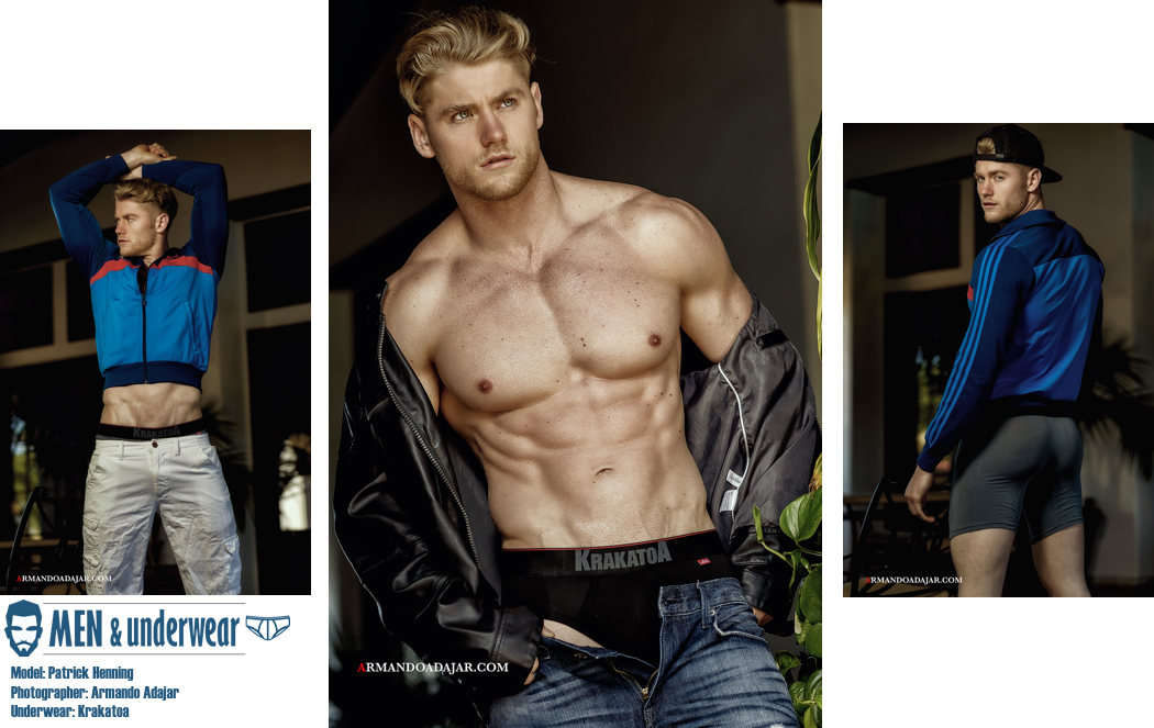 The model we feature today is called Patrick Henning and you are about to see his latest collaboration with the talented photographer Armando Adajar. The editorial the two men produced features the latest underwear designs by Krakatoa. Patrick, who is also a dancer, is seen wearing black briefs and grey, athletic long boxer briefs. The photographer/master in men’s underwear photo shoots chose a fairly simple backdrop with just enough colour to accentuate the flawless physique of his model but also the underwear he is wearing.