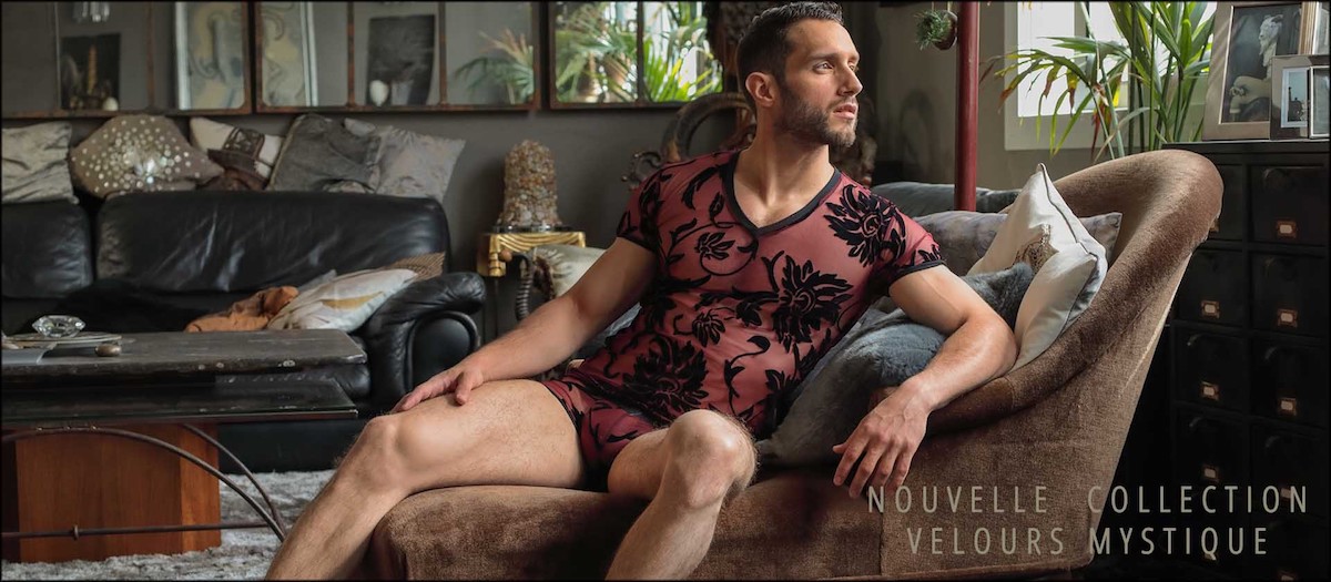 After this small introduction, it is time to see the new collection, Velours Mystique, which features designs that this brand knows very well: transparent underwear in masculine cuts. The collection is made from an extremely lightweight fabric made in Italy. This sheer fabric features a floral pattern made of velvet. In the photos below you see the tanktop and two of the underwear from this collection. There are three more styles and one more colour. The photos are uncensored which explains why we put NSFW at the title above.