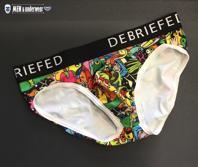 If you like colours, you will definitely love these briefs. The colours are just amazing! The fabric is a polyester blend that responds extremely well to printing. It is so vibrant that will instantly make you smile. Moreover, all those googly eyes of the, very funny indeed, monster drawings really made me laugh. It is hard to pick just one colour of it to describe the colour tones. There is green, red, yellow, blue, pink, almost every colour you can imagine. And the more you look at it, the more details, drawing, faces and colours you see! The waistband is black with the Debriefed logo repeated. The print is a large scale one so I assume that every pair of briefs may be slightly different depending on which part of the fabric the panels are cut from. This adds an element of individuality to each pair.