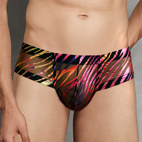 Something sexy yet colourful is our underwear suggestion today! The Rainbow Zebra Mesh Bikini by Doreanse is a low rise brief with wide sides made from a semi-transparent material decorated with a multicolour freestyle stripes pattern. The waist and leg trims are covered with the same fabric, the pouch is contoured to allow more space at the front and there is no branding anywhere.