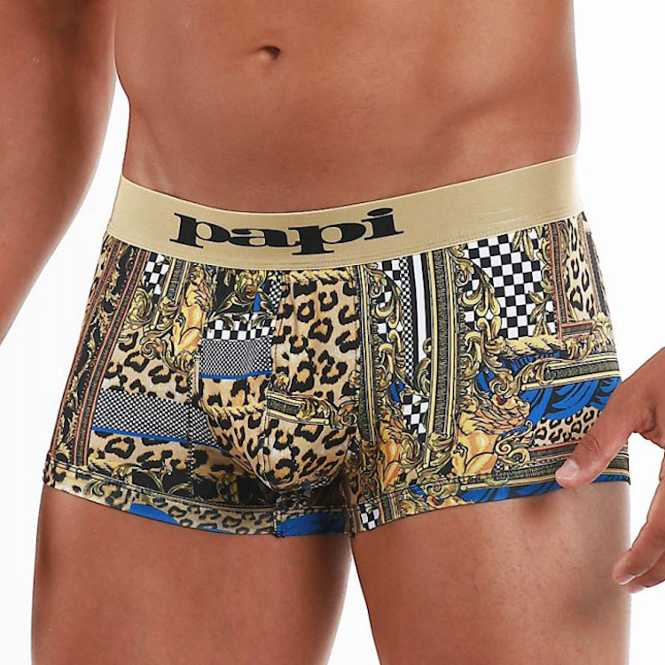 Our underwear suggestion today is a pair of trunks in a vivid print! The Baroque Patchwork Trunks by Papi is part of a Special Edition collection, inspired by the Baroque style with highly ornate designs. An outburst of colours and patterns in rich gold, white and blue colours over a silky smooth, 4-way stretch microfiber. Made for confident men with a fearless sense of fashion! The style is a normal rise trunk with contoured pouch and an elasticated waistband. The waistband is in gold to match the print and featuring the logo of Papi in the centre front.