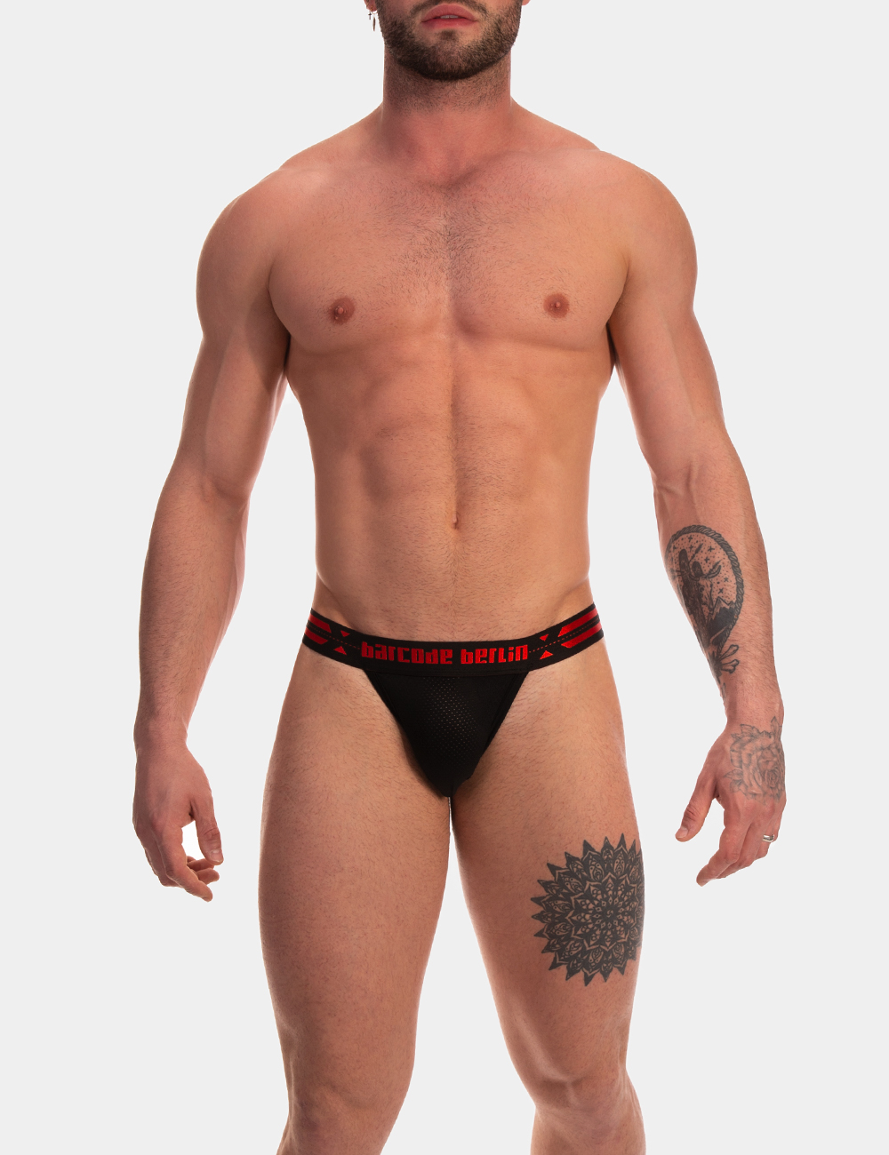 The Thong Claude is a new and quite innovative thong design by Barcode Berlin. The German brand created a super sexy style based on men’s thong but with a Barcode Berlin twist to it! The pouch is contoured to offer space and made from athletic mesh, a lightweight perforated fabric, perfect to keep you cool for longer. The back is though where everything gets more interesting! Attached to the waistband is a strap of piping which at the middle is sewn onto a vertical piping that connects it to the bottom of the pouch. This structure holds the underwear together and exposes your buttocks in all their glory! This thong comes in black and is combined with a beautiful black and red, elasticated waistband. The logo of the brand is featured in red lettering at the front and centre of the waist. Wanna try it? Click on the photo below or the hyperlink at the beginning of this paragraph to see more of it and to buy it from our shop.