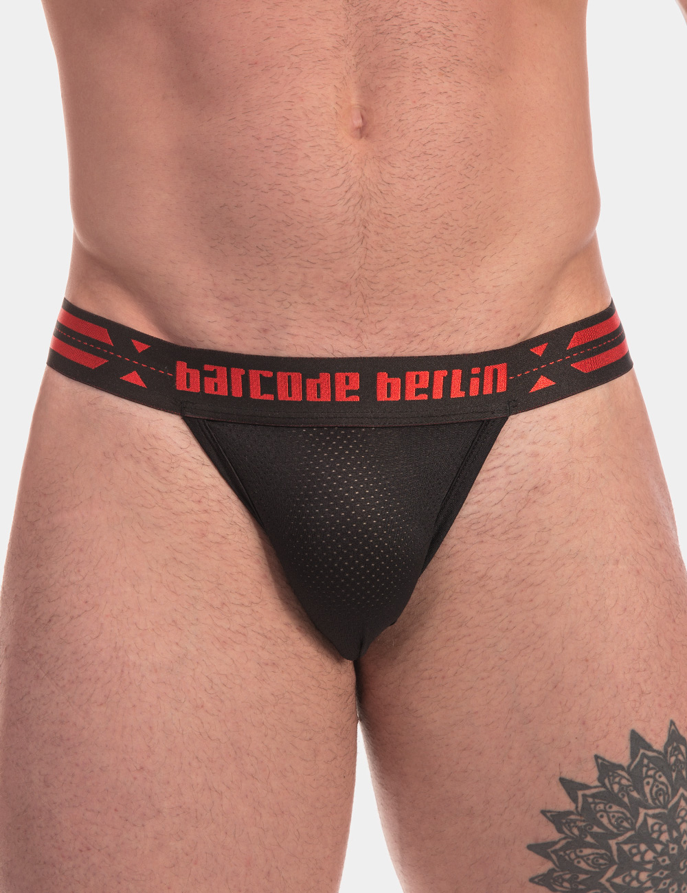 Our underwear suggestion today is the Thong Claude by Barcode Berlin, an innovative and sexy underwear design. The German brand creates an innovative, super sexy style based on men’s thong but with a Barcode Berlin twist to it! The pouch is contoured to offer space and made from athletic mesh, a lightweight perforated fabric, perfect to keep you cool for longer. The back is where everything gets more interesting! Attached to the waistband on the back is a strap of piping which at the middle is sewn onto another stripe of vertical piping that connects it to the bottom of the pouch. This structure holds the underwear together and exposes your buttocks in all their glory. This thong comes in black and is combined with a beautiful black and red, elasticated waistband. The logo of the brand is featured in red lettering at the front and centre of the waist.