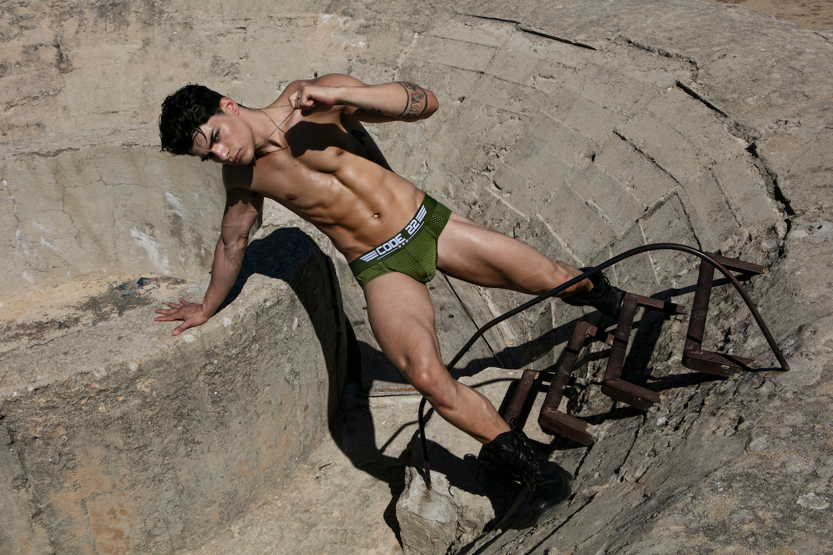 We are happy to show you today the first part of the campaign for the new underwear collection of CODE 22. The Spanish brand called upon talented photographer Joan Crisol and model/dancer Aritz for the shoot of the new lines. Against an industrial backdrop, photographer and model worked on a beautiful set of photos with a contemporary feel. The underwear you see below are all from the Army collection of CODE 22, available in its entirety from Men and Underwear – The Shop. This line comprises briefs and trunks in two colour ways: khaki and camo print. This line features a new waistband for CODE 22 with the logo framed by military inspired stripes and stars. The cuts are comfortable, great to wear every day and all day. The fabric is a perforated polyester blend that keeps your body cool for longer.