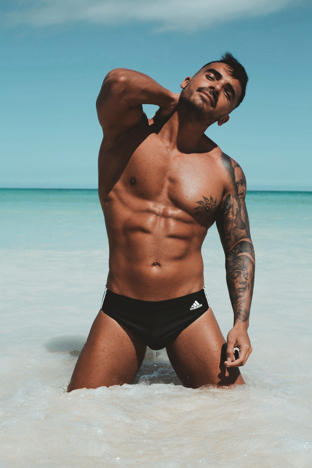 Model Rubén Pérez gets photographed by De La Cruz in swimwear by Adidas in Eroticco Magazine.