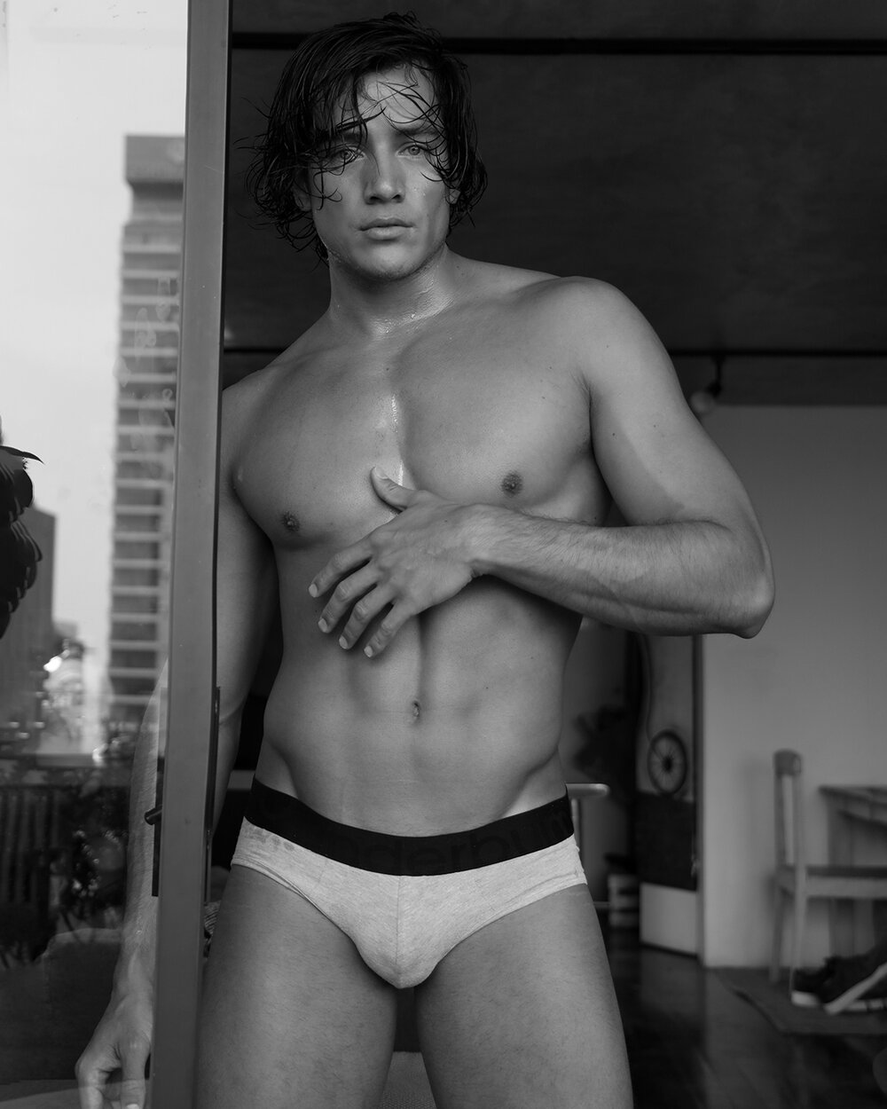 Model Juan Pintos gets photographed in underwear by CK and Rounderbum by Marco Ovando for LoveSexo Magazine.