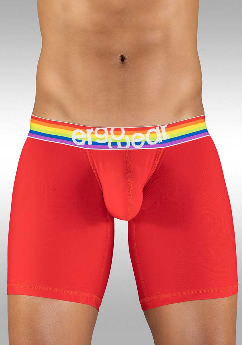 Our underwear suggestion today is the Ergowear MAX XV Pride Midcut Long Boxer. This red underwear is a traditional boxer brief with a super low-rise on the waist with a rainbow 40mm elasticated waistband. They have a mid-cut style that is longer on the leg that finishes around two thirds down your thighs with flat seams around the legs and inside the thighs, as well as on the rear to ensure a comfortable fit. The nose shaped pouch lifts your manhood away from your body. The bulge effect is slightly less than some other Ergowear styles, but a comfortable fit is guaranteed as it shapes to your natural contours. They feature the original three-dimensional ergowear pouch design with a flat centre seam. The pouch is designed to lift your manhood up and away from your legs for a comfortable and naturally enhancing effect. Not only does this give you an impressive bulge, it also moves your manhood away from your legs to help with movement and offers excellent support. The rear gives full coverage whilst keeping the material to a minimum.