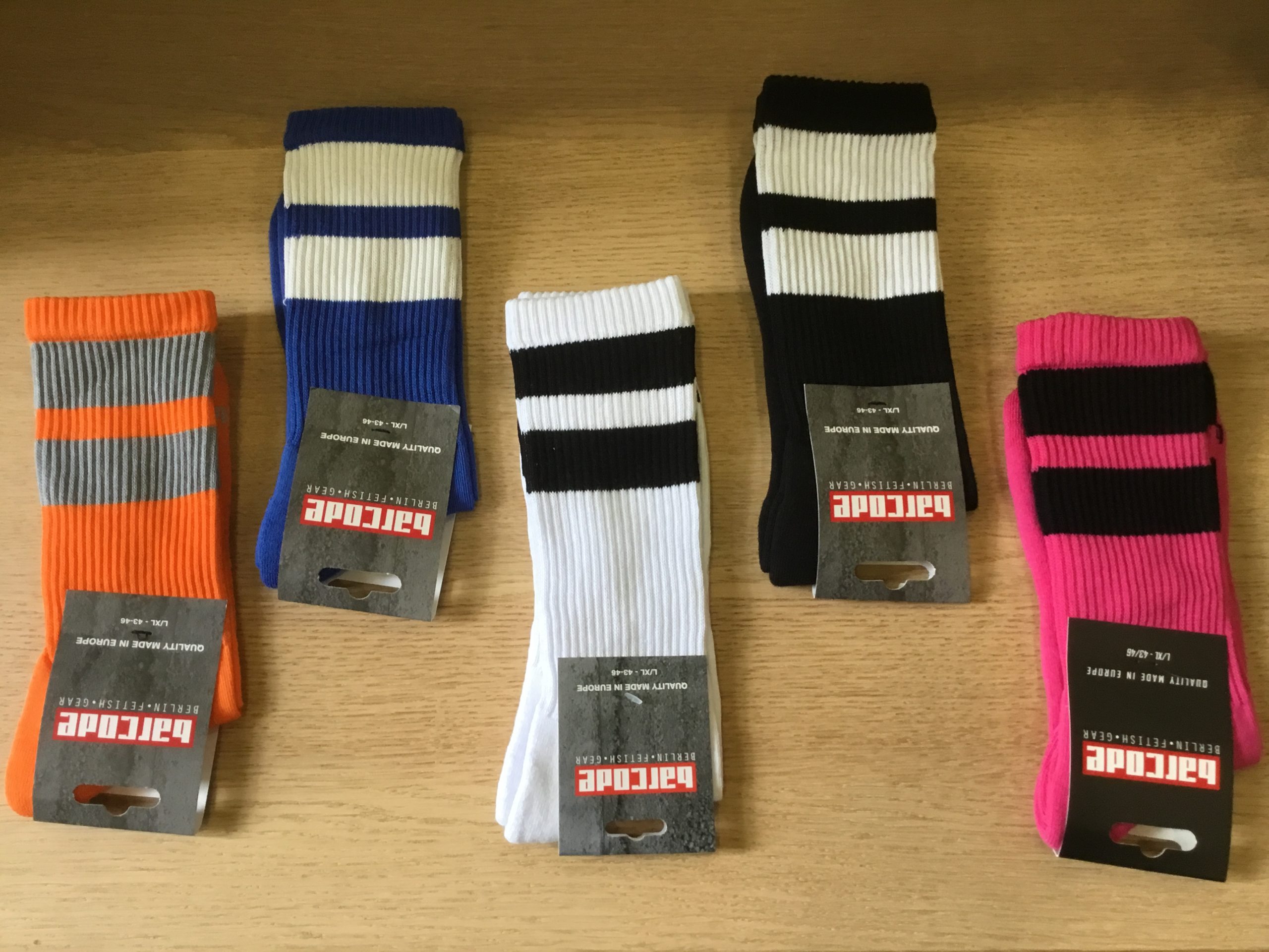 In our current selection, you will now find the Pride Socks in two lengths and in two colour ways: black and white. Also available are the Gym Socks in pink with black, neon orange with grey, royal blue with white, white with black and black with white! Along with these, you will also find 4 more quirky socks with wording on them: Power, Horny, Shy Geek and Fucking Magical Amazing! If you are obsessed with socks or just want to add a dash of colour to your daily outfit Barcode has you covered. All socks are cotton based so they are perfect for sports and for everyday wear. Check out some below and make sure you visit the socks section in our shop to see more and get yourself a pair or a few!