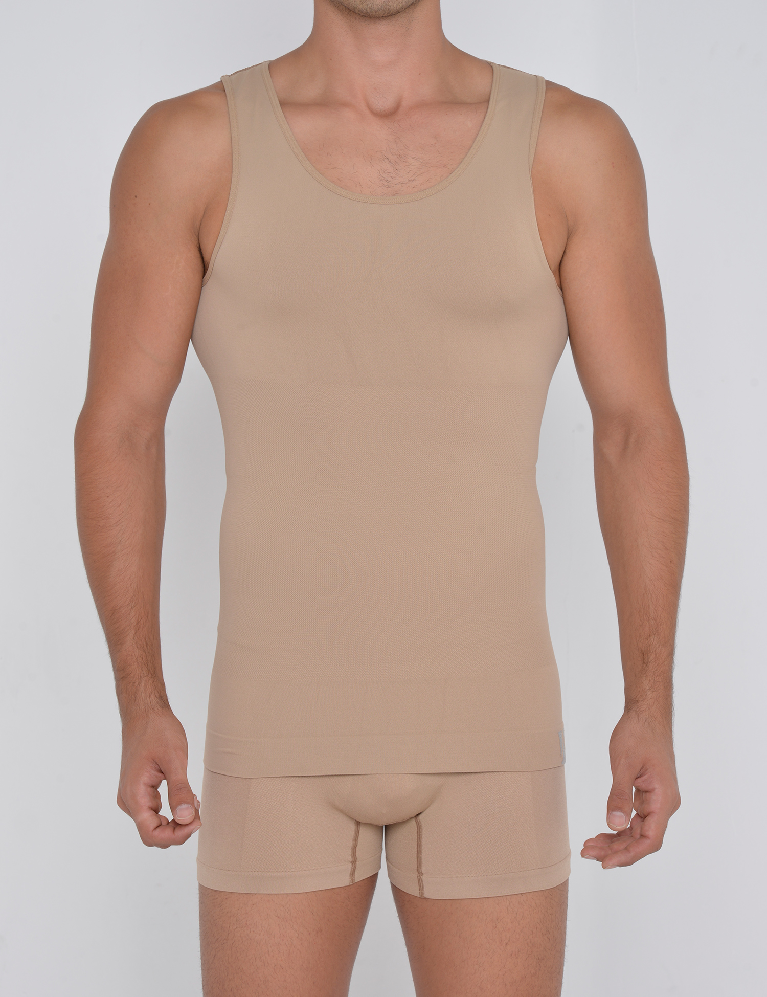 Back in stock is the slimming beige tank top from this collection. This versatile piece not only shapes your waist but also provides protection. It can be worn underneath any shirt or top, making it a perfect addition to your wardrobe. The top portion of the tank top is seamless and made from highly stretchable material, while the wide elasticated belt runs around your waist and extends below your hips. You can adjust the belt to target specific areas you want to shape more. It is designed to stay in place and move with your body. Available in sizes M, L, XL, and XXL.