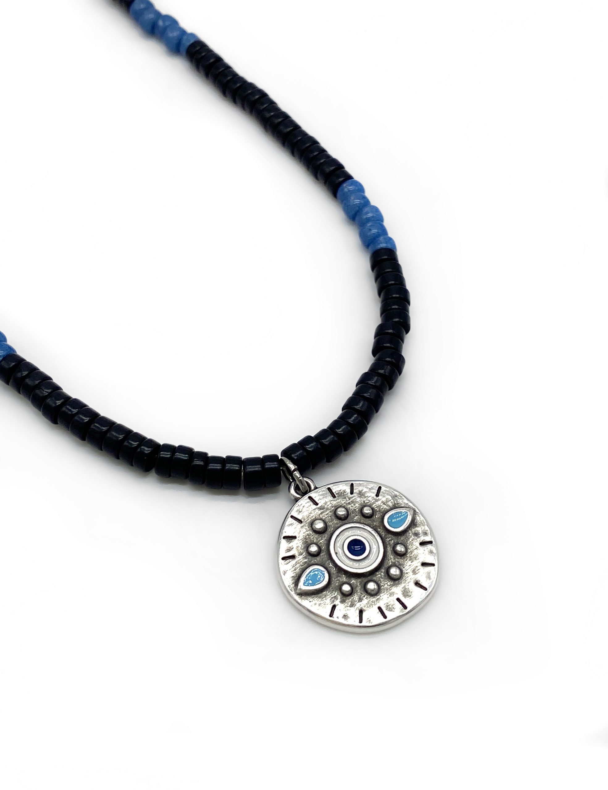 The first of three new necklaces is the Heishi necklace – Apricot and Cream. This is a beautiful piece in orange, off-white and white polymer heishi beads and stainless steel details. The second is the Howlite necklace – Off white and Turquoise. This is a fantastic piece made with Howlite, semi-precious, stones of different shapes and turquoise and off-white tones. The third is the Howlite necklace with Ethnic pendant – Black and Blue. This is a striking necklace with a pendant in silver and with enamel decorations. The black howlite semi precious stones mix amazingly well with blue glass beads to give the perfect summer touch to your outfit. All three necklaces have clear references to summer and got inspired by the bright colours of the long and warm days. These are perfect for any look and for any occasion and can be worn by everyone.