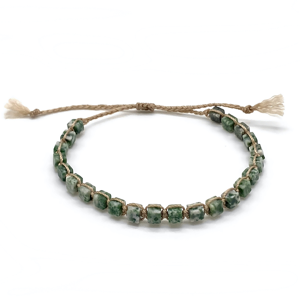 The first one is the Zig Zag Bracelet in Green, a new addition to the Zig Zag bracelets, featuring shiny green glass beads in a zig-zag pattern. The second one is the Gemstone Bracelet – Jade Forest Mix which features Jade stones in shades of green arranged beautifully with a brown string. Jade comes with several healing properties that cleanse and remove toxins and negative energy from the body, also known for attracting good luck and is often used for good luck charms. The third one is the Cubes Gemstone Bracelet – Natural White Howlite which features striking off-white cube-shaped stones. Howlite is a stone for patience and calm. It’s said to help the wearer calm down, find patience and to not focus too much on unimportant matters. It also promotes a good night’s sleep and aids with anxiety and stress. The fourth one is the Cubes Gemstone Bracelet – Tree Agate, one more addition to the best-selling Cubes Gemstone Bracelets collection, featuring stones of Tree Agate in fantastic green and white tones. This stone is said to have a deep connection to nature and has been considered by many civilisations as a stone of plentitude. In ancient Greece, this stone was associated with dryads and to receive a plentiful harvest, the stone could sometimes be found buried in the fields. On a personal level, the stone is said to bring peace and calm to its wearer and to improve one’s immune system. It encourages self-expression and wanting to enjoy and appreciate the small things in life that are all around us.